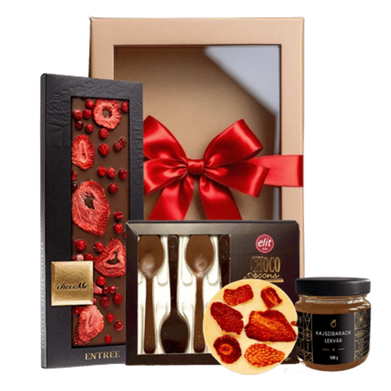 Ajándékdoboz: Díszdoboz dekorációs szalmával és masnival. A termékeket stílusosan elhelyezzük a dekorációs szalmában és szatén masnival zárjuk le a dobozt.